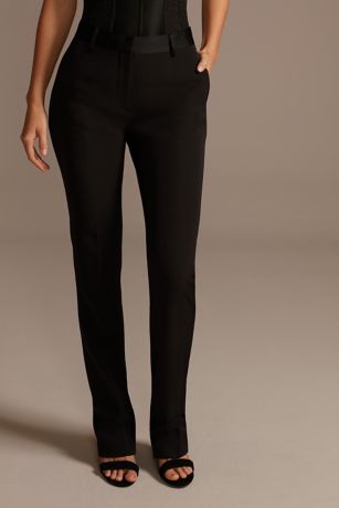 Featuring a satin waistband and a relaxed leg fit, these suit pants pair beautifully with a coordinating jacket and a bustier or tank.
