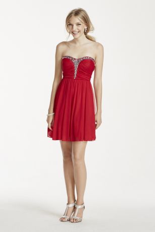 - Strapless sweetheart bodice is embellished with rhinestones and features eye-catching ruched detail.
