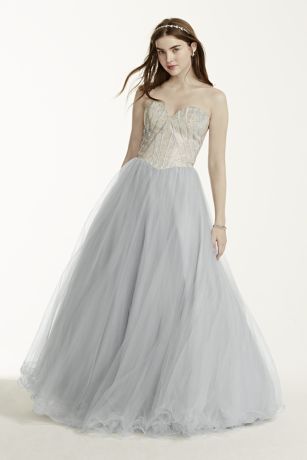 - Ultra-feminine strapless sweetheart bodice is delicately encrusted with tiny rhinestones and features satin piping detail.