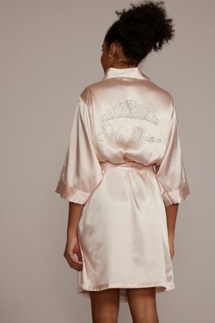 Make the day that much more special in this soft and comfy satin getting-ready robe that the quinceanera will love to wear long after her big event. Featuring rhinestone details on the tiara and "Mis Quince" script.
