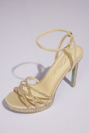 These ultra-glam strappy platform sandals with stiletto heels are topped with glittery rhinestones.