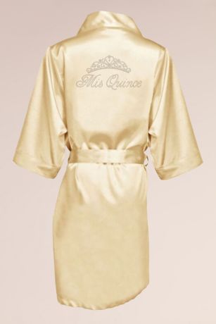 A sweet satin robe for Miss Quince. Make her day that much more special in this soft and comfy getting-ready robe that she'll love to wear long after her big event. Featuring rhinestone details on the tiara and "Mis Quince" script.