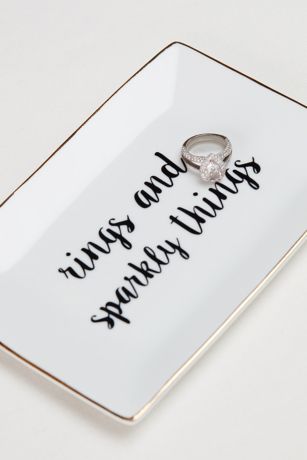 This ring dish is the perfect gift for the newly engaged girl! Rectangular in shape, this ceramic ring dish features "Rings and Sparkly Things" printed in black with a gold border. A stylish way to keep her ring safe and sound!