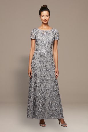 Completely covered in dimensional rosettes from the cap sleeves to the floor-sweeping skirt, this petite lace occasion gown is in bloom.