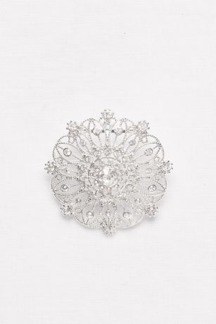 This crystal filigree sash slider slips onto a length of ribbon, or can be worn as a brooch.