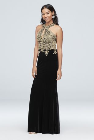 Round Neck Metallic Lace and Velvet Halter Gown