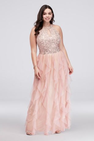 Vertical ruffles of airy mesh give a floaty feel to this sequin lace halter gown.