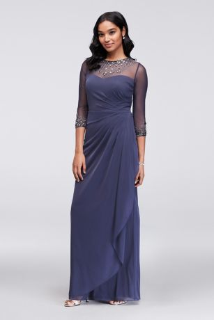 The mother of the bride or groom will shine in this draped-and-ruched sheath dress, topped with a crystal neckline and illusion mesh three-quarter sleeves.
