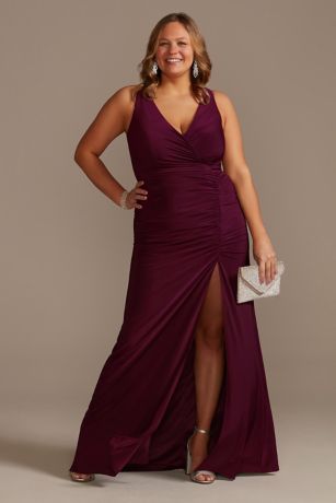 Detailed with front and back ruching, a V-neckline, and a front slit, this form-fitted jersey sheath dress is ultra flattering.