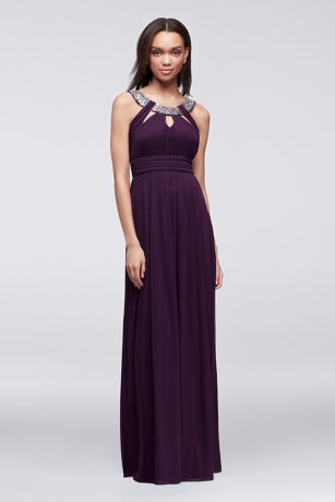 The soft ruching of this long matte jersey gown provides Grecian goddess vibes, while the jeweled U-neckline feels like an Old Hollywood accent.