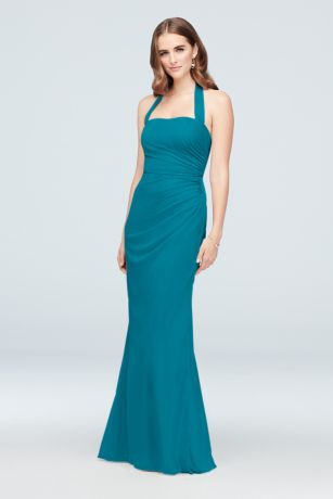 This mesh sheath bridesmaid dress features flattering front and back ruching and halter straps that tie at the nape of the neck.