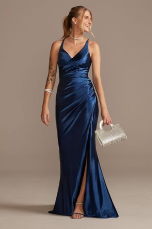 Sleek and slinky, this stretch satin sheath gown shines bright for homecoming or prom.