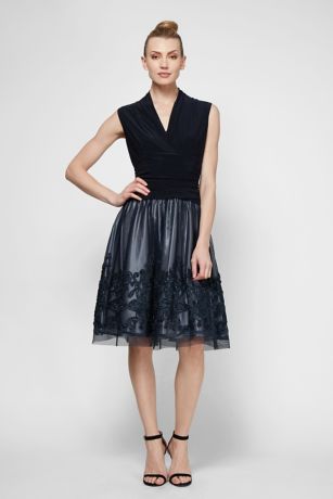 Swirls of soutache trim embellish the mesh skirt of this knee-length party dress. Topped with a V-neck, ruched-waist jersey bodice.