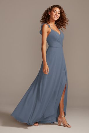 This faux-wrap style chiffon bridesmaid dress easily fits into a romantic bride's wedding day vibe. Ruffle-framed spaghetti straps and a flirty skirt slit add a boho feel to this lovely look.