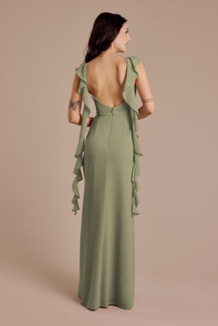 With ruffles at the spaghetti straps and a scoop neckline, this airy chiffon A-line dress is a romantic choice for bridesmaids and other special events.