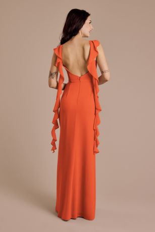 With ruffles at the spaghetti straps and a scoop neckline, this airy chiffon A-line dress is a romantic choice for bridesmaids and other special events.