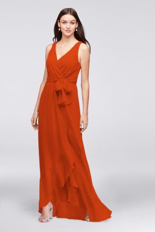 Easy and breezy, this crinkle chiffon bridesmaid dress has the look, and figure-flattery, of a wrap silhouette. The surplice bodice and flounced skirt lead toward a slight high-low hem, perfect for showing off strappy heels.