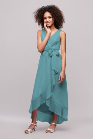 This breezy crinkle chiffon junior bridesmaid dress has the look of a wrap silhouette. The surplice bodice and flounced skirt lead toward a slight high-low hem, perfect for showing off sweet flats or low heels.