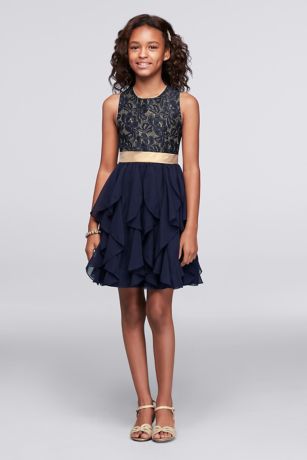 A hint of gold peeks through the lacy bodice of this ruffled party dress, as a gold band accents the waist.