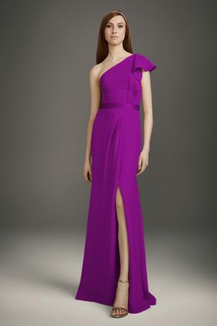 Crafted of figure-flattering double cloth, a drapey knit with a moves-with-you stretch lining, this is one of the most comfortable bridesmaid dreses you'll find. And with a ruffled one-shoulder neckline and a lustrous satin belt, It's also one of the most sophisticated.