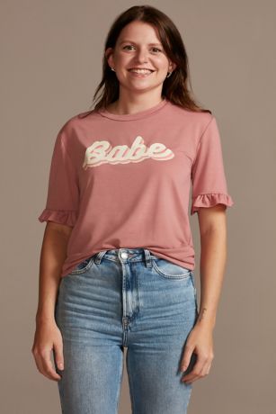 Ruffled sleeves and a retro-style "babe" motif give this cute tee extra oomph. Perfect for bachelorette parties and bridal showers.