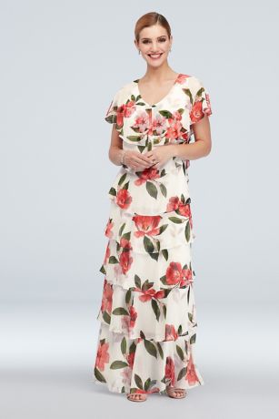 Floating tiers cascade down this floral chiffon flutter-sleeve gown. The faux-capelet style bodice features a dainty crystal-embellished closure.