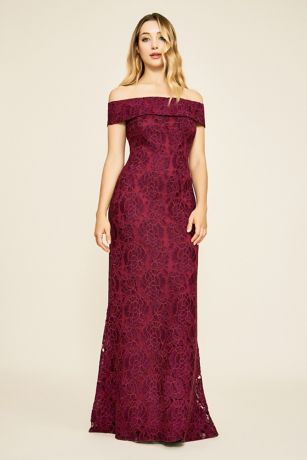 Sangria Embroidered Lace Off-the-Shoulder Gown