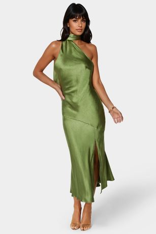 Elegant with a modern twist, this sash neck one-shoulder satin midi dress drapes beautifully for a sleek, sophisticated silhouette. The statement sash detail adds a touch of drama, perfect for any standout occasion.