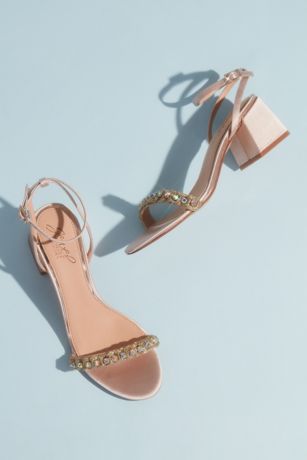 The perfect combination of comfy and cute, these strappy satin block heels feature glittering crystals on the toe strap.