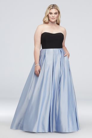 A colorblocked ball gown, featuring a box-pleated satin skirt and jersey bodice with illusion cutout details at the side.