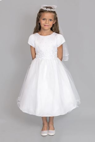This classic girls dress dotted with tiny 3D flowers at the waist is adorable for first communions and flower girls.
