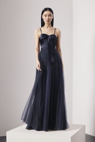 A silky satin sweetheart bodice meets a soft tulle skirt for effortless modern romance. Finished with a sculpted bow detail, this A‑line dress blends structure and airiness for a look that feels fresh and feminine.