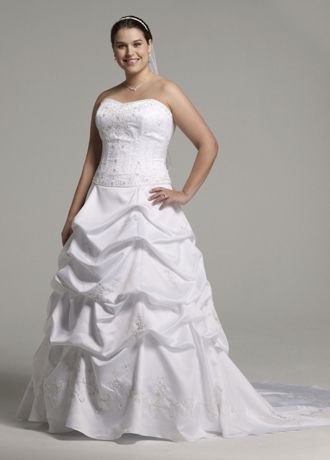 Strapless satin ball gown with beaded embroidery, beaded bodice pickup.