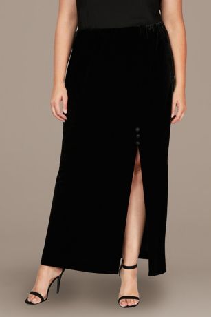 Perfect with any of our stretch velvet tops, this long, pull-on stretch velvet plus size skirt is topped with three satin-covered buttons at the slit.
