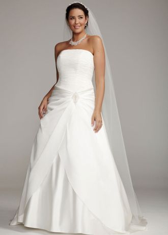 Strapless satin a-line features pleated bodice with a slimming dropped waist accented with pearl & sequin embellishment.