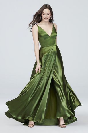 Sleek and stunning, this flowing silky A-line gown has delicate spaghetti straps that create a plunging V-neckline. Accentuate your features with the unique lace up back detail and the crossover-style skirt.