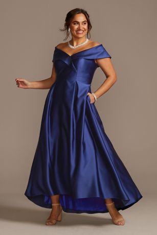 Fit for royalty, this off-the-shoulder ball gown is crafted from radiant satin and detailed with a chic portrait collar.