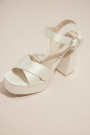 Walk tall and shine bright in these satin platform sandals with wide crisscross straps and chunky block heels.