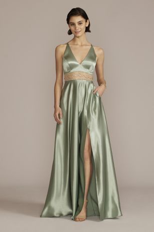 Bare some skin beautifully in this satin sheath gown. The illusion waist comes embellished with shining crystals, making it an accessory in itself!