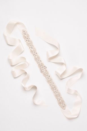 Beaded pearl and crystal flowers burst on a slim satin sash.