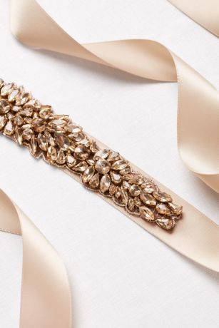The dramatic crystal embellishment of this slim satin sash catch the light, providing a luxe finish to simple gowns.