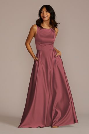 Classically beautiful, this satin bridesmaid dress features a chic boatneck and full A-line skirt with pockets.