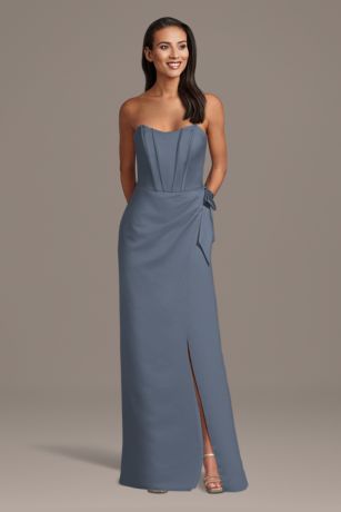 With a structured corset bodice and chic bow at the hip, this strapless sheath made of silky satin is a chic choice for bridesmaids or special occasions. Optional spaghetti straps let you customize your look.