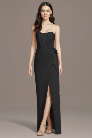 With a structured corset bodice and chic bow at the hip, this strapless sheath made of silky satin is a chic choice for bridesmaids or special occasions. Optional spaghetti straps let you customize your look.