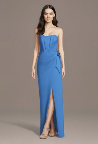With a structured corset bodice and chic bow at the hip, this strapless sheath made of silky satin is a chic choice for bridesmaids or special occasions. Optional spaghetti straps let you customize your look.