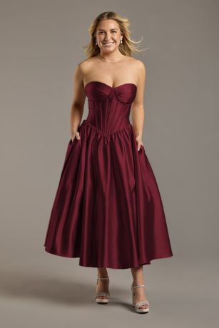 Bodice boning and a slight basque waist create an ultra-flattering silhouette on this satin drop waist midi dress that's a match for bridesmaids and guests alike.