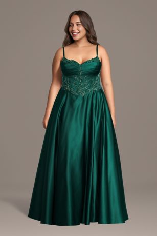 This satin sweetheart ball gown features a flattering basque waist and an illusion applique back for a romantic, modern touch. Perfect for prom or any special occasion, it combines elegance with showstopping detail.