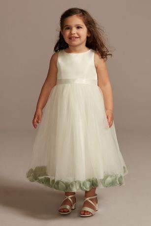 Coordinate your flower girl's look with your bridal party! This satin and tulle flower girl dress features a bubble hem skirt filled with faux flower petals that complement your bridesmaids' color palette. The dress is finished with a matching satin sash. Mini magic! This style is available in infant and toddler sizes.