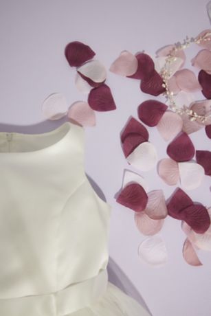 Coordinate your flower girl's look with your bridal party! This satin and tulle flower girl dress features a bubble hem skirt filled with faux flower petals that complement your bridesmaids' color palette. The dress is finished with a matching satin sash. Mini magic! This style is available in infant and toddler sizes.