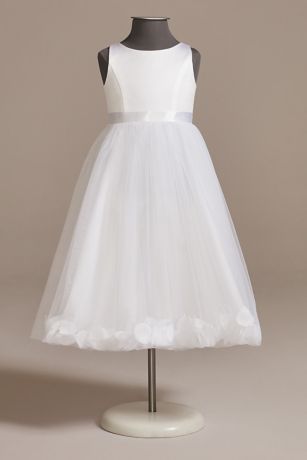 Coordinate your flower girl's look with your bridal party! This satin and tulle flower girl dress features a bubble hem skirt filled with faux flower petals that complement your bridesmaids' color palette. The dress is finished with a matching satin sash. Mini magic! This style is available in infant and toddler sizes.